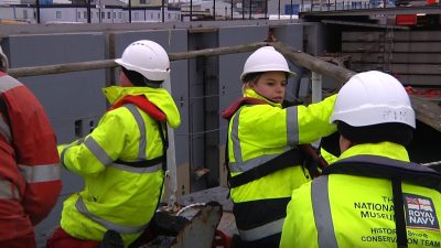 And WHAT a barge she is!! This is ‘Terra Marique’, a semi-submersible barge into which RML 497 will be floated, so that the WWII Fairmile motor launch can be transported to Hartlepool for the National Museum of the Royal Navy. ‘Terra Marique’ is the pride and joy of Robert Wynn and Sons, specialised transportation engineers. She has stern doors that can be opened to allow cargoes to float in – float in because she can also sink down, a bit like a submarine (but not so far!), by flooding side tanks. Then, with cargo safely loaded, the stern door is closed and the water pumped out of the side tanks to raise her, and at the same time out of the cargo compartment too. She can self-propel if need be. She’s a game changer, and in regular demand. No wonder.