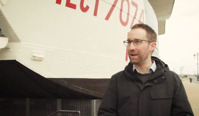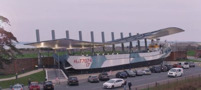 One of the finishing touches was another sweeping structure – the ramp leading up the tank ramp of LCT 7074, lowered every day to let visitors in to see ship and tanks, and closed off at night. Essential to do that because the ship would be a bit of a beacon for the mischievous and destructive if it were not protected. Indeed a display on the canopy’s supporting arches along the starboard side of the ship has been modified, with images featuring Maritime Films UK’s specialist photographer David Botwinik removed – because some over-enterprising locals had been using the pictures’ frames to climb on board out of hours. A real pity as David’s pictures, as always, are superb. But not lost, because they can be found across several pages of the brochure for visitors to the ship and the museum.