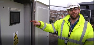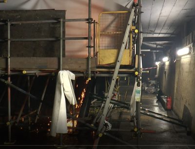 Someone had to do it. As the cutting of the first of HMS ‘Victory’s giant steel cradles proceeded, with infinite care, it was very important to check whether any heat was building up on the inward side of the action – down deep in the hold. Dark and close in there for the young guy looking after it hour after hour into the night (much of the work on ‘Victory’ is being done late and early – she’s staying open to the public throughout the two decades-plus of the work on her – as England Expects..!) Here Leon is operating an infra-red monitor, which will warn him if anything is getting too warm. Vital work, because the whole ship is highly flammable – old, dry timbers, paint, cordage, caulking –all of it ever ready to burn. No-one can forget what happened to ‘Cutty Sark’…